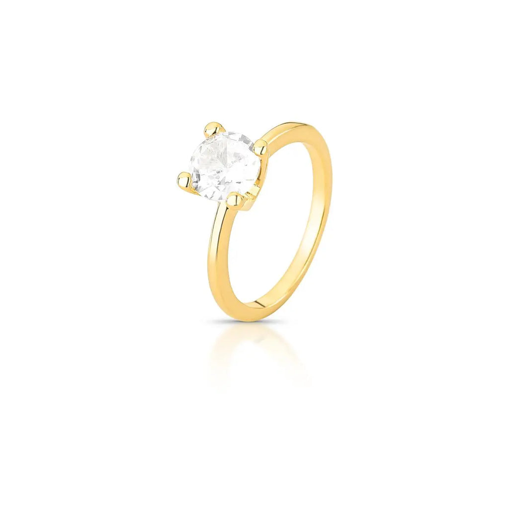 Anel solitário banhado a ouro com cristal redondo, design sofisticado com quatro garras e laterais vazadas, perfeito para realçar a elegância em qualquer ocasião.