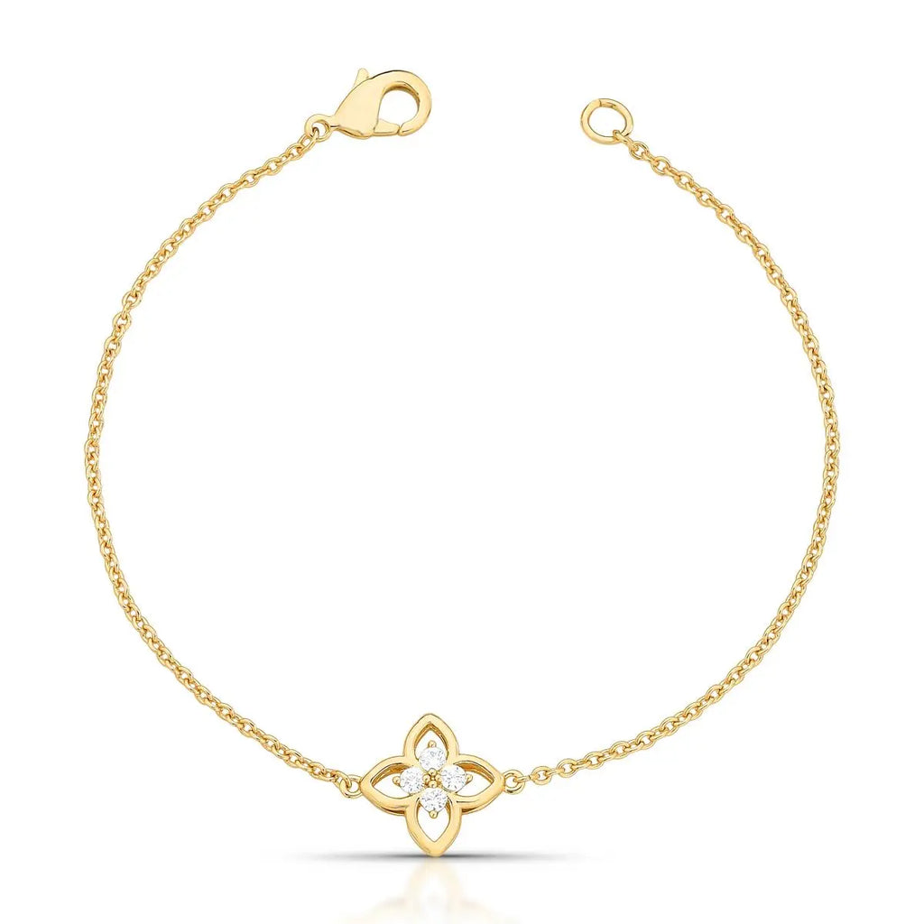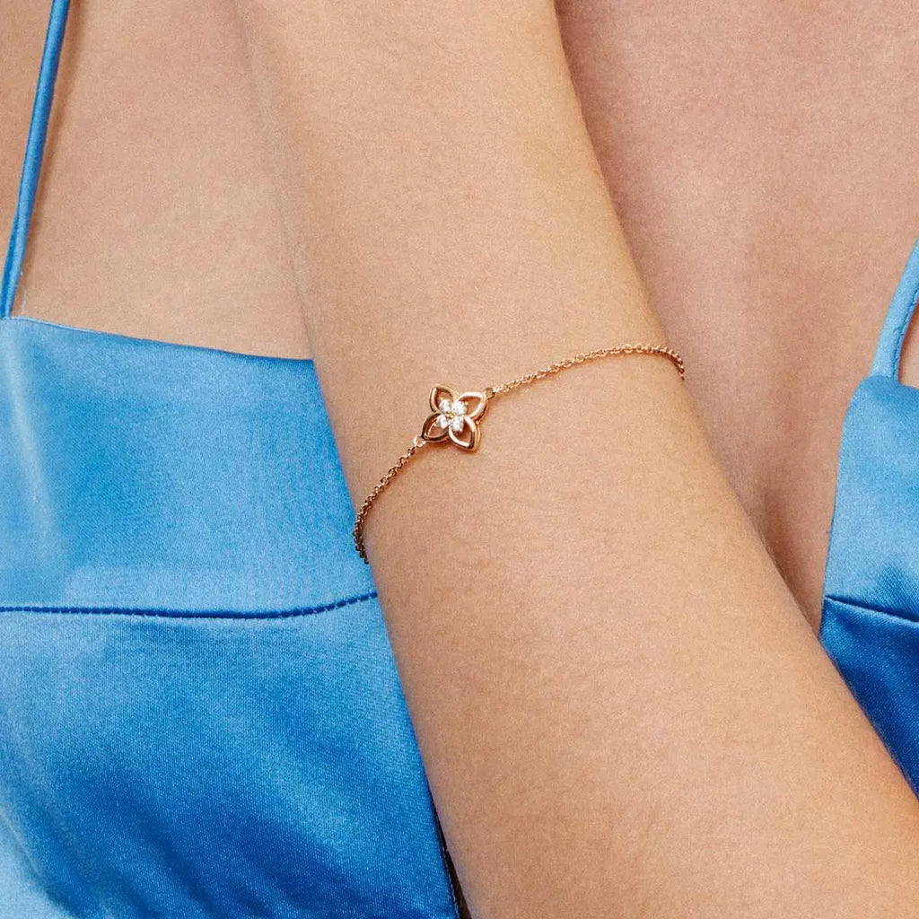 Pulseira banhada a ouro com pingente vazado em formato de flor, composto por cristais redondos. A malha de elos ovais acrescenta delicadeza e estilo à peça, perfeita para ocasiões especiais e complementos diários.