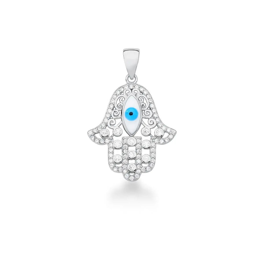 Pingente vazado mão de fátima com olho grego esmaltado azul e branco, e zircônias redondas e cravejado de micro zircônias em todo o contorno ambas na cor branca prata 925 banho de ródio.