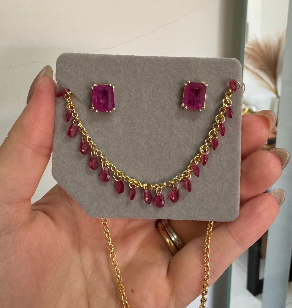Colar modelo choker com corrente de elo português com pingentes e Brincos de Cristais Fusion Pink em formato de gota, banho de ouro 18k.