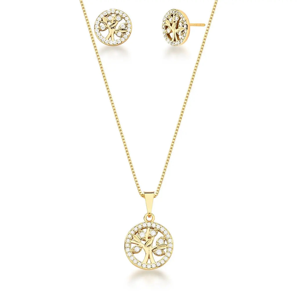 Conjunto colar em malha veneziana, com pingente redondo árvore da vida e cravejado de zircônias e brinco ambos na cor branca banhado a ouro.