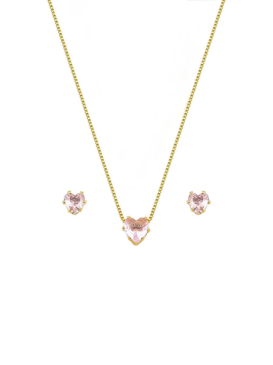 Conjunto de colar e brinco em formato coração de zircônia rosa, banho de Ouro.
