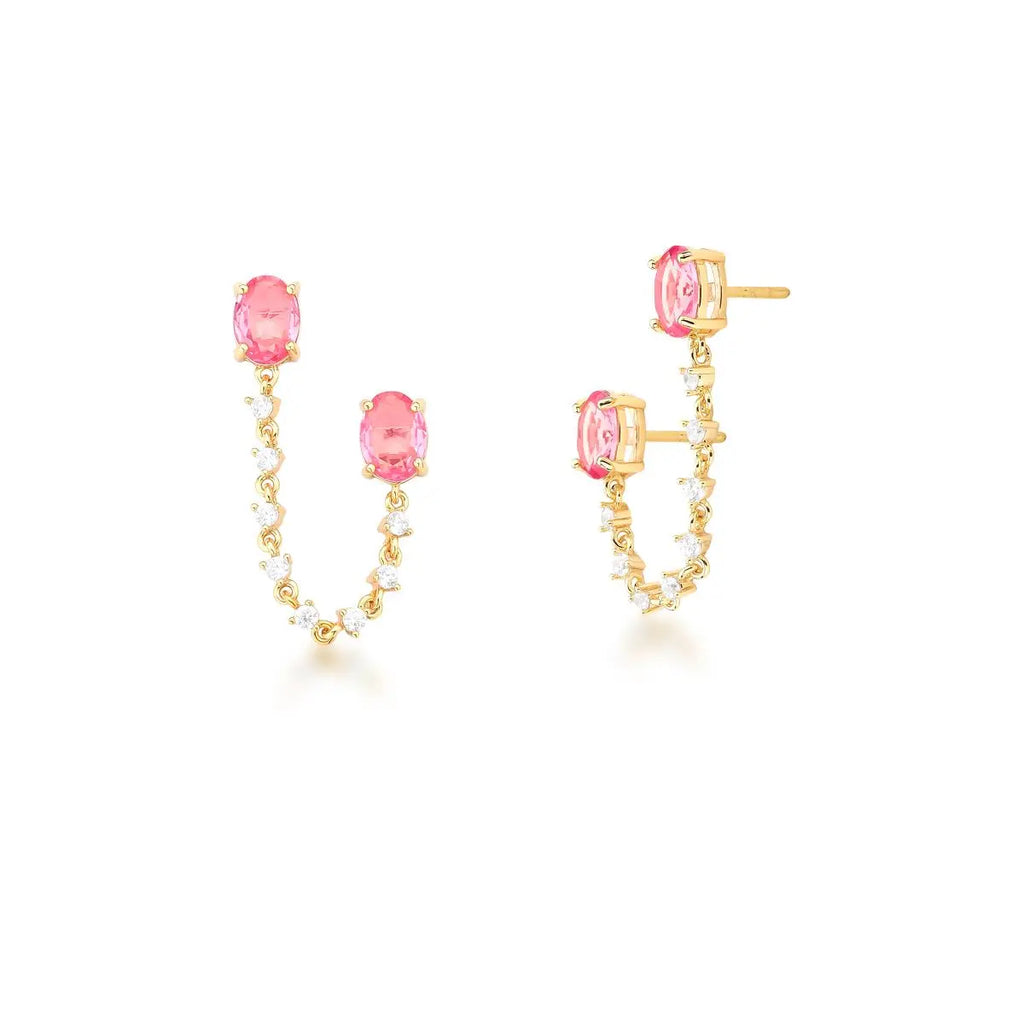 Brinco ear line primeiro e segundo furo com cristais ovais e redondos na cor Rosa Claro, banhado a ouro.