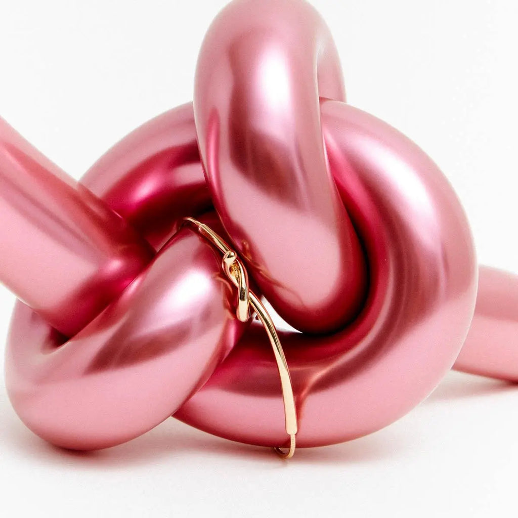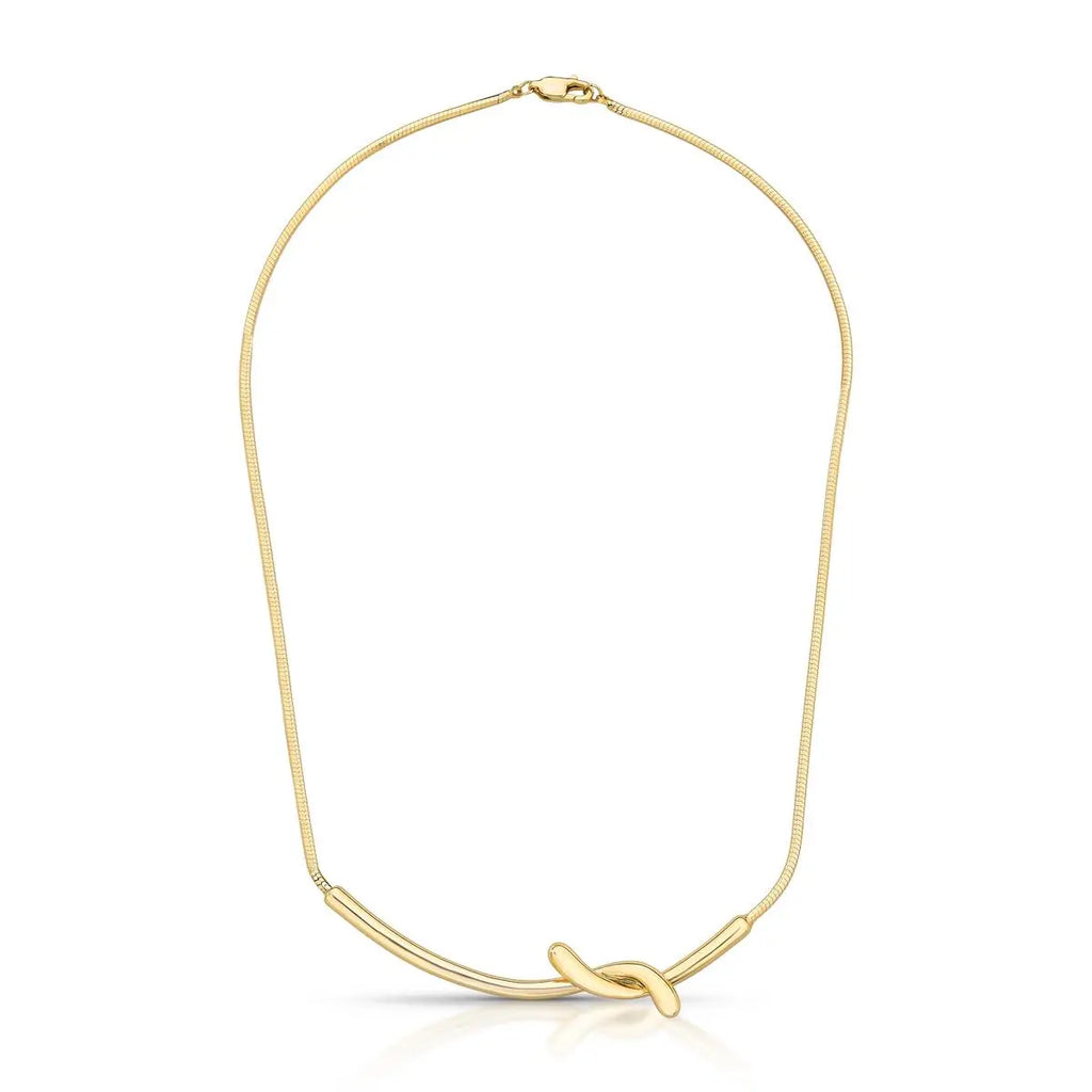 Colar banhado a ouro com design curvo e liso trançado em nó, confeccionado com malha rabo de rato. Peça elegante e versátil, ideal para complementar diversos estilos com sofisticação.