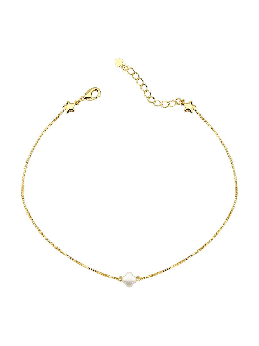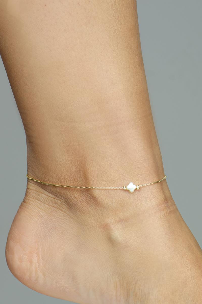 Tornozeleira Veneziana Com Trevo Pérola Banhado a Ouro 18K.